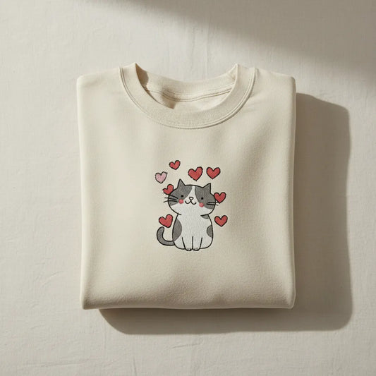 Cat with Hearts Embroidery Design for Sweatshirt, Animal Machine Embroidery File