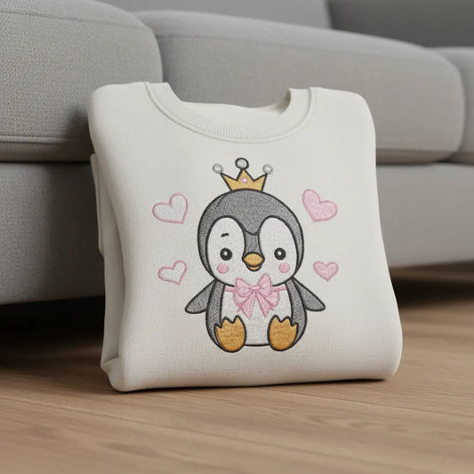 Crowned Penguin Embroidery Design with Bow and Hearts, Animal Machine Embroidery File